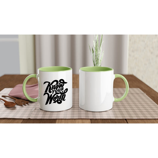 Inspirational "Know Your Worth" 11oz Ceramic Mug with Color Inside